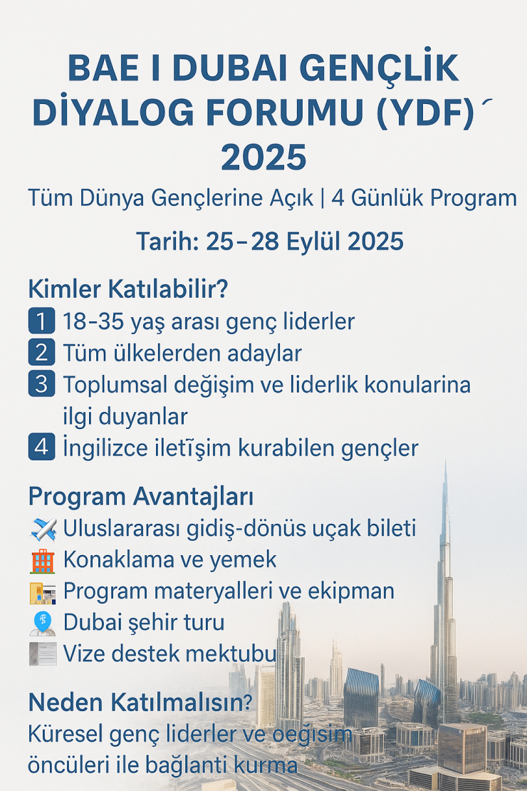 Dubai Gençlik Diyalog Forumu (Youth Dialogue Forum – YDF) 2025, 25–28 Eylül 2025 tarihlerinde Birleşik Arap Emirlikleri’nin (BAE) gözde şehri Dubai’de düzenlenecek. RiseUp All tarafından organize edilen bu 4 günlük uluslararası program, 18–35 yaş arası genç liderleri ve toplumsal değişim öncülerini bir araya getiriyor.