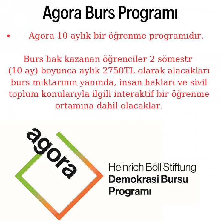 Agora, Heinrich Böll Stiftung Derneği’nin demokrasi programı altında, toplumsal sorunlara ve insan hakları konularına ilgili, gönüllülük potansiyeli yüksek ve toplumsal güçlenme için sorumluluk almak isteyen üniversiteli gençler için oluşturulan yepyeni bir burs programı.
