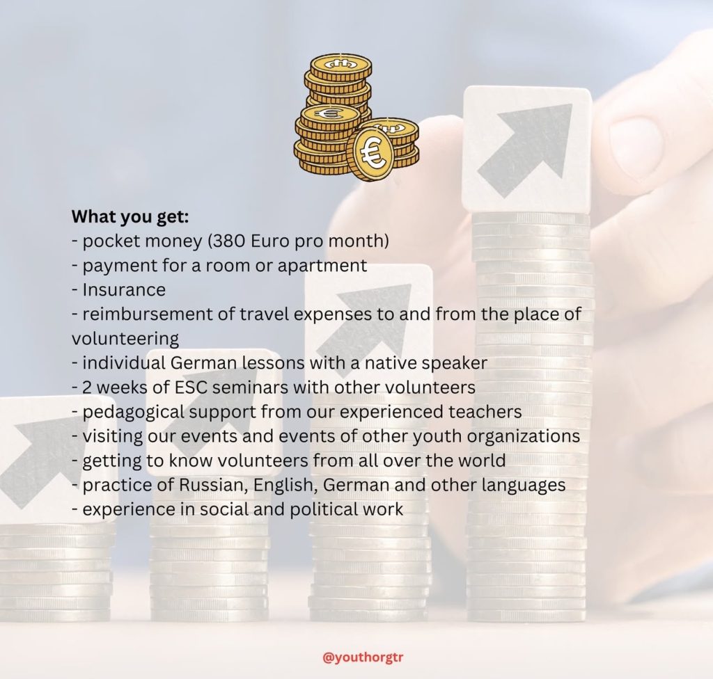 ESC gönüllülük projeleri ile 18-30 yaşları arasında yüzlerce gencimiz mezuniyet ve dil yeterliliğine bakılmaksızın, 1 yıla kadar Avrupa’da diledikleri bir ülkede gönüllü faaliyetlerde yer alarak yabancı dillerini geliştirebilmekte, yepyeni bir dil öğrenebilmekte kültürlerarası iletişim becerilerini artırabilmekte, hiç tanımadığı yeni bir ortamda çalışabilme ve iletişim kurabilme stratejilerini öğrenebilmekte ve bu sayede ülkeye döndüklerinde kazandıkları özgüvenle iş piyasasında seçeneklerini çeşitlendirebilir. Üstelik bütün bunlara hiç bir ücret ödemeden ulaşmaları mümkün. Gönüllülerin yeme, içme, konaklama, vize, sigorta masrafları karşılanmaktadır. Üstelik ülkeden ülkeye değişen koşullarda günlük 3-6€ arasında bir miktar cep harçlığı da veriliyor.