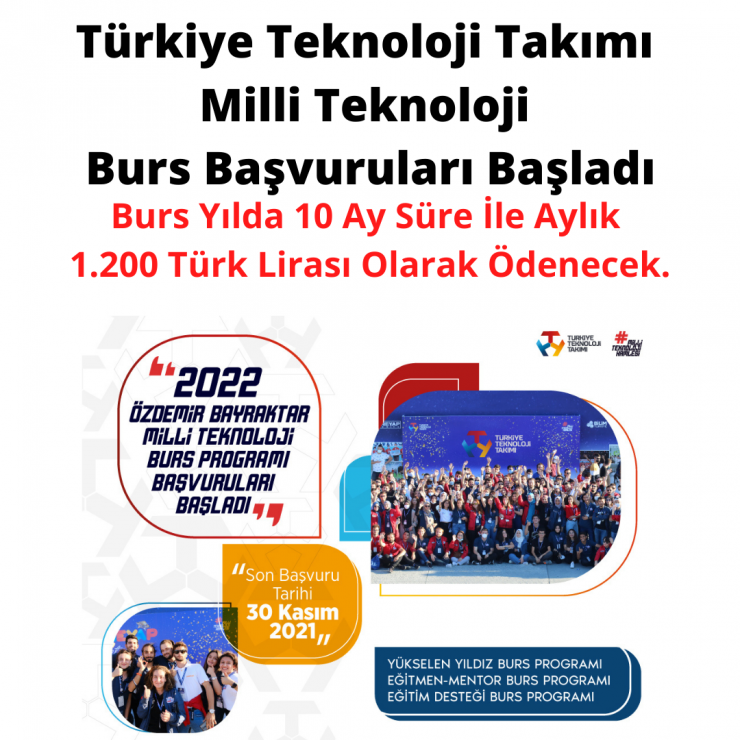 Türkiye Teknoloji Takımı Milli Teknoloji Bursu Başvuruları Başladı. T3 Vakfı Türkiye Teknoloji Takımı Milli Teknoloji Bursu Yükselen Yıldız, Eğitmen-Mentör Ve Özdemir Bayraktar Burs Programı Olarak 3 Farklı Program İle Ortaokul, Lise Ve Üniversite Öğrencilerine Verilecek.